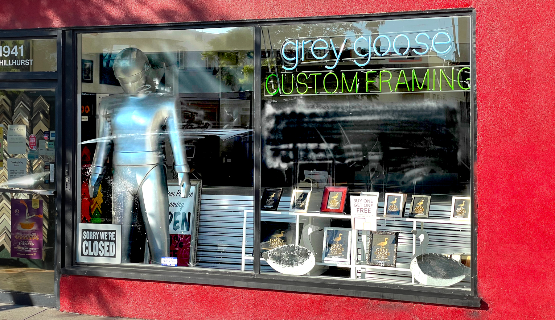For a number of years, the Gray Goose Framing shop moved across the street on La Brea, but then relocated again on North Hillhurst Avenue in the Los Feliz district. If you find yourself toodling through Hollywood, perhaps going to or coming back from the Griffith Observatory or the Greek Theater, it makes a nice Gort Drive-By for Sci-Fi fans.