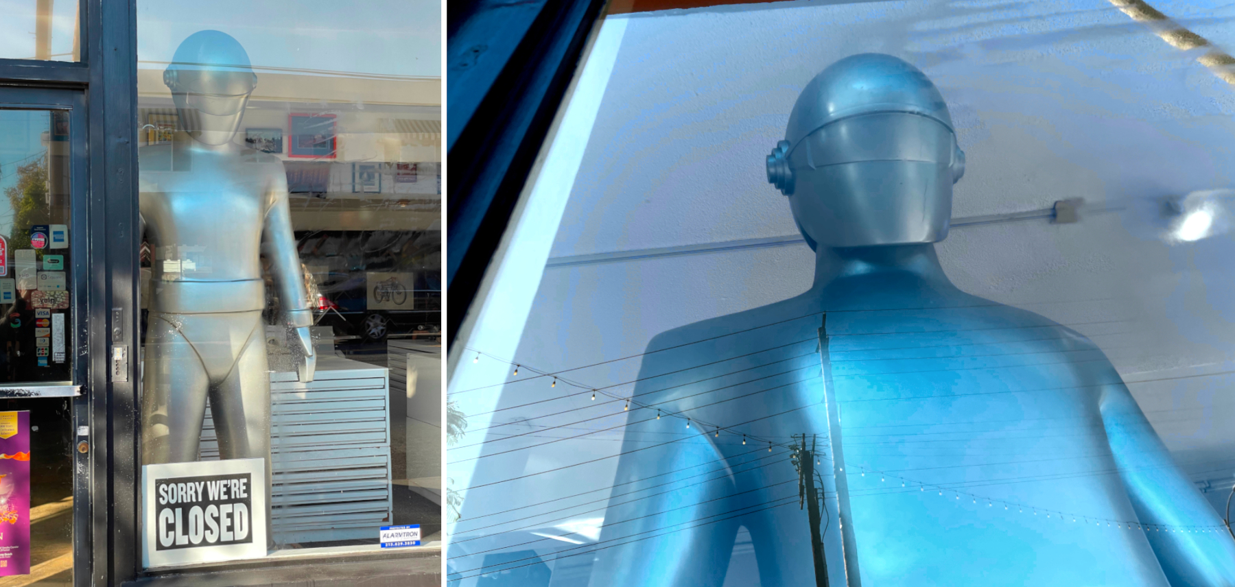 The figure has been displayed this way seemingly forever. It appears to be an authentic dummy from back in the day, made for the movie or perhaps for promotional use in movie theater lobbies. There are likely several more out there somewhere. The shop has often posed Gort with his head turned to one side or tilted down. The robot can’t do that in the movie, but it looks good in the Up Angle. At least once, they put a Santa hat on him for the holidays, but so far not this year. He inspired my daughter’s festive Christmas banner, ‘Peace on Earth Or Else.’