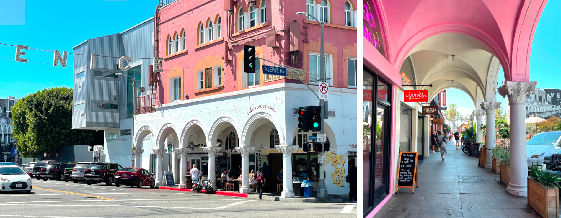 Well, we had a need to seek out a recommended food stand on the Boardwalk, and ventured there last Sunday, just to try our luck. It was something of a miracle that we chanced on a parking spot just a 3 blocks away. Some film location expert I am … I thought that the iconic Venice ‘collonade’ streets were further north, and had been comepletely eradicated. I was looking in the wrong spot … at Venice Way and the beach there still exists a partial block of the buildings with the columns made immortal by the movies Touch of Evil and Dementia. Some Angeleno I am, reporting on something everyone here knows well, except me.