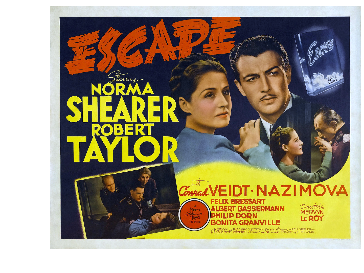 Escape was directed by Mervyn LeRoy6 , who also hired Arch Oboler to rewrite the film. Oboler’s initial excitement turned into impatience when the writing assignment stretched out due to the demands of the Hollywood star system7 , “August 22, 1940 … Dear Lewis … Believe it or not, I’m still working on ‘Escape’; added scenes, this time, to help the [Norma] Shearer close-up ego. Apparently there’s no escape from ‘Escape’ but a shotgun, a noose, and a bottle of cyanide …”8 Despite his restlessness, Oboler must have been pleased with the New York Times’ ecstatic review: