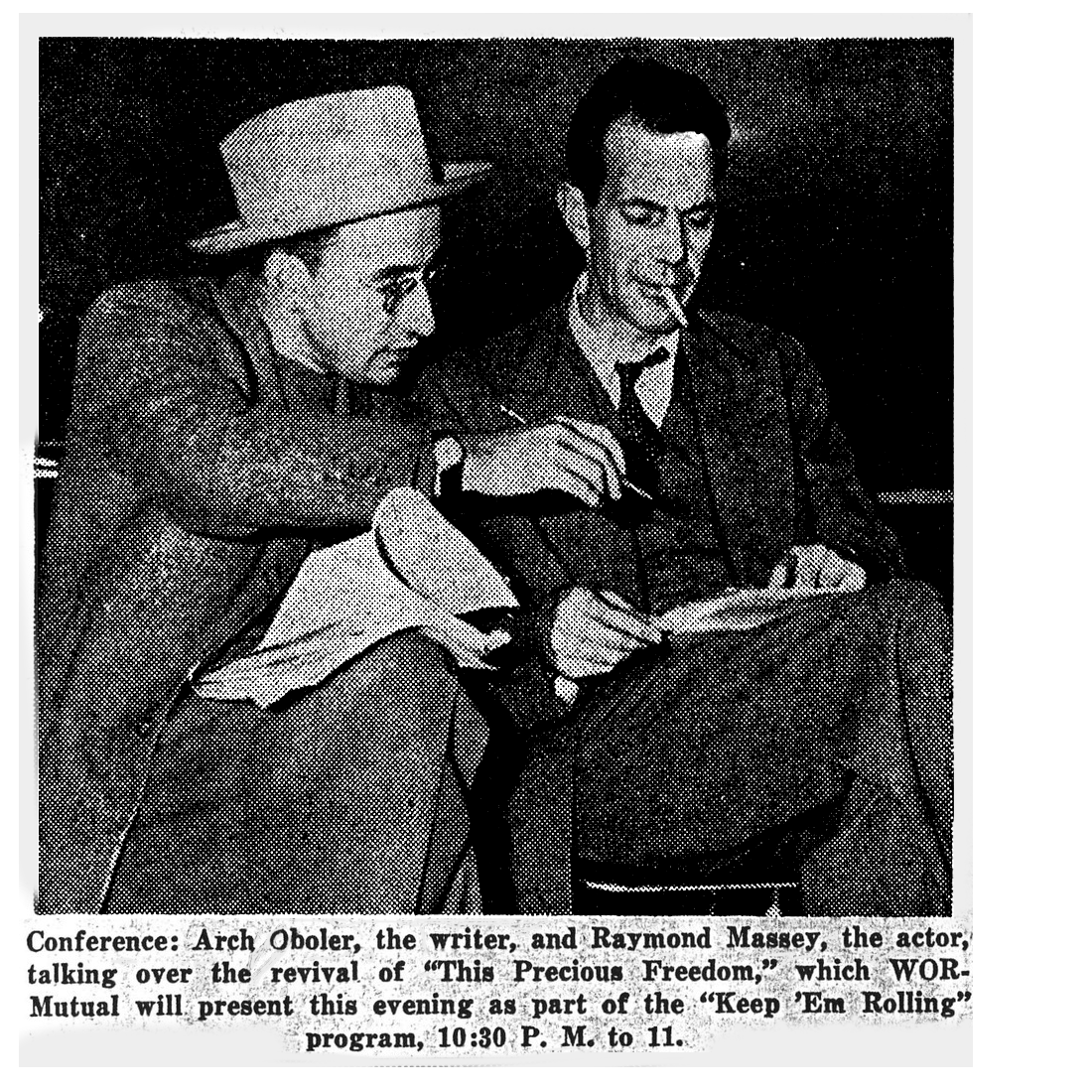 45 The radio play “This Precious Freedom”, which stars Raymond Massey, is entirely different from an earlier radio play by Arch Oboler, which is also titled “This Precious Freedom”. The earlier radio play is about a machinist who loses his livelihood and family. In a card index of copyrights, Oboler designated the earlier radio play as “This Precious Freedom [Plot #1]”, and the later radio play, starring Raymond Massey, as “This Precious Freedom (Bill of Rights) [Plot #2]”. See Card index of Oboler’s radio series and episodes. Box 363. Arch Oboler Collection, Motion Picture, Broadcasting and Recorded Sound Division, Library of Congress. “This Precious Freedom [Plot #1]” is published in Fourteen Radio Plays by Arch Oboler. “This Precious Freedom (Bill of Rights) [Plot #2] is published in This Freedom: Thirteen New Radio Plays by Arch Oboler and Oboler Omnibus: Radio Plays and Personalities.