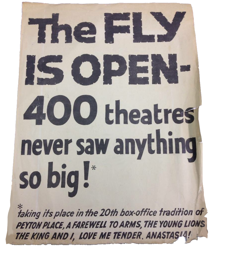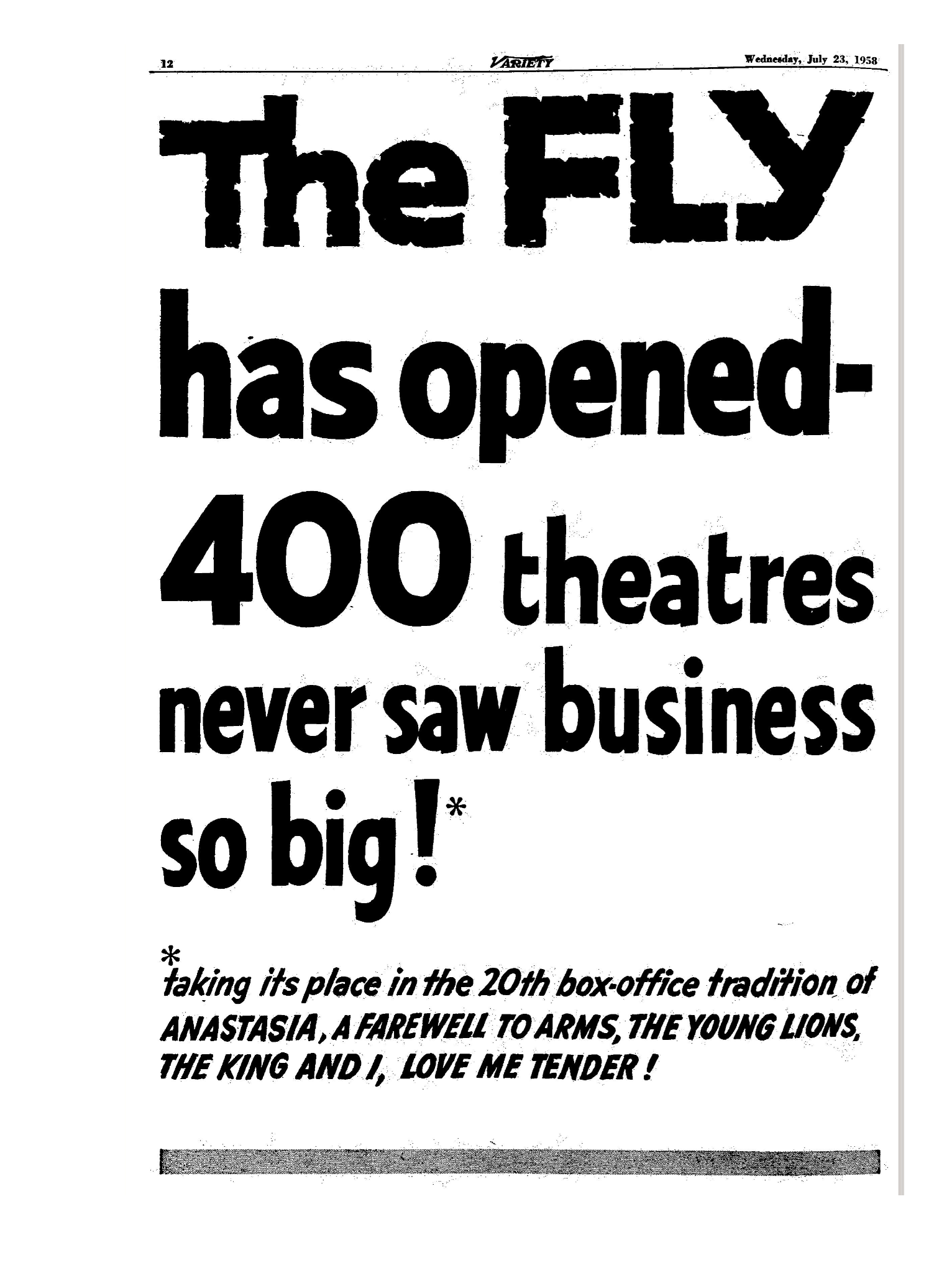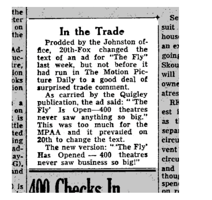 “Prodded by the Johnston office (the MPAA), 20th Fox changed the text of an ad for “The Fly” last week, but not before it had run in The Motion Picture Daily to a good deal of surprised trade comment.”