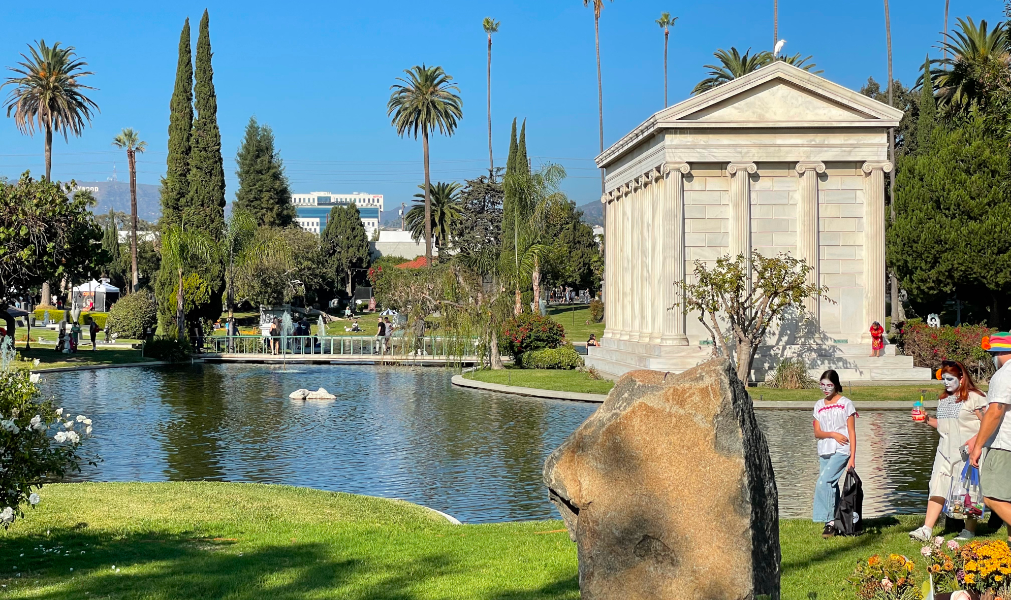It’s a very pretty cemetery, and a good place for food, music and lots of people running around with skulls painted on their faces. All of these shots get bigger; on the upper left of this picture can be seen part of the Hollywood Sign peeking out from behind a tree. ↑