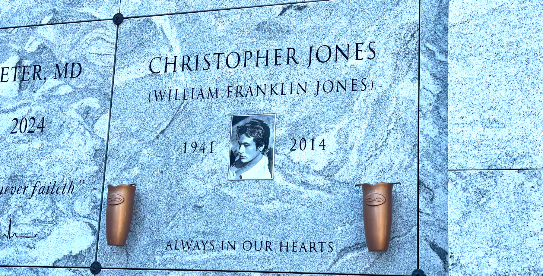 When the time came to go home we decided not to walk down Gower. Finding the Van Ness exit took us through a newer section of mausoleum crypts. We didn’t poke through them looking for celebs, yet couldn’t miss three more noted personalities that stood out, this one and two more just below.