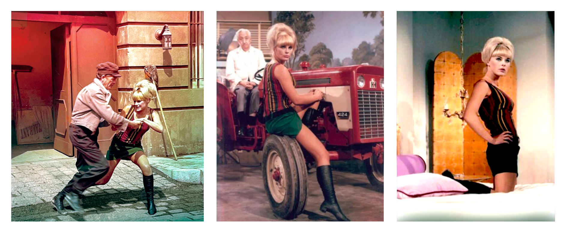The mystery photo is of Elke Sommer … it’s from a 1968 movie called The Wicked Dreams of Paula Schultz. Nothing solves a question better than a matching shot of the same woman in the same costume … and Ed’s picture isn’t faded at all. Here are all three in a row. Oh … correspondent Jon Paul Henry did some color work on the original faded photo, which now looks much better.